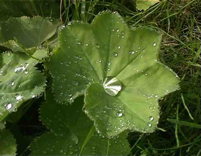 Der Weiche Frauenmantel heißt so, weil er rundum weich behaart ist. Im Tau gibt