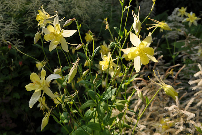 Die Gelbe Akelei steht sehr schön zusammen mit weißen Waldgeißbart und blauen