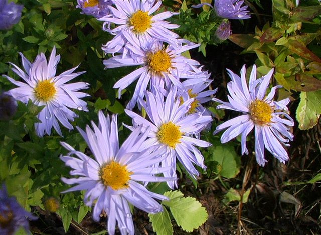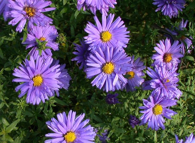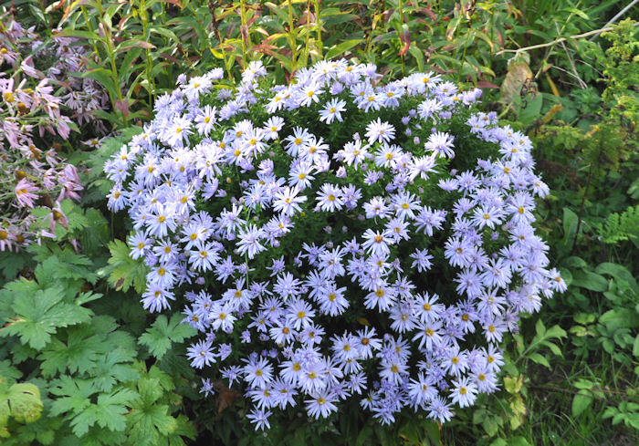 Aster dumosus, die kaum kniehohe Buschige Aster aus Nordamerika ist mit ihren zahlreichen Sorten sehr häufig in den Gärten zu finden. Sie eignen sich sehr gut als Einfassung am Weg.