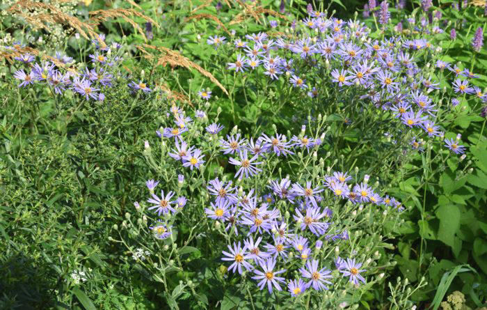 Großblütige Aster kommt in blauen und weißen Auslesen vor. Ihre Heimat