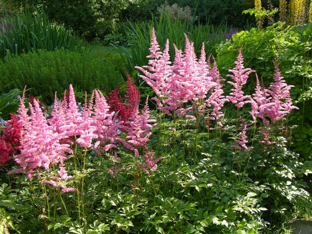 blüht im Juli. Sie verlangen feuchten, halbschattigen Boden. Ihre feingliedrigen Blütenstände von weiß bis purpurn ergeben schöne niedrige Pflanzenbilder, wenn man sie durcheinander wachsen lässt. Übrigens kenne ich nicht den Unterschied zwischen allen Hybriden der Gattung Astilbe. Möglicherweise sind das auch Arendsii- Hybriden. Wer kennt sich aus?