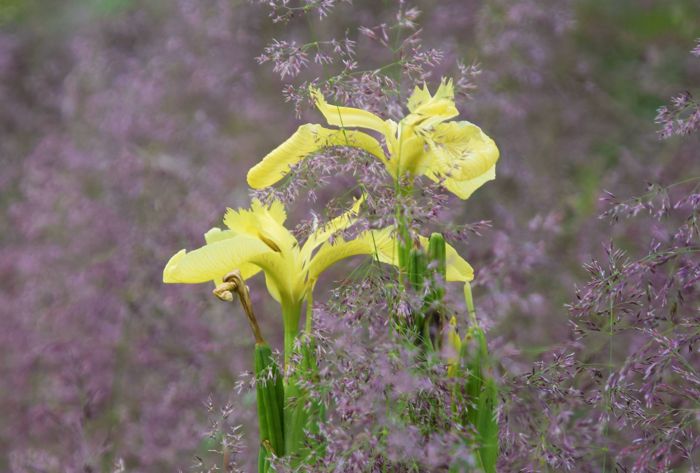 Die hellviolette Blütenfarbe wirkt gut zusammen mit Iris pseudacorus