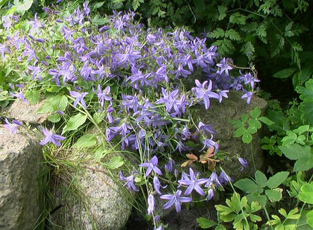 Hängepolsterglockenblume, ist in der Sorte 'Blauranke' besonders starkwüchsig