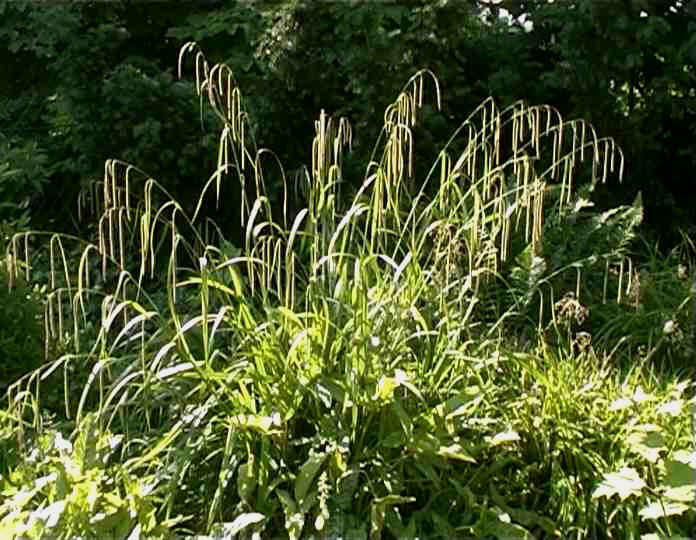 Carex pendula, die brusthohe Riesensegge, ist ein weit überladendes