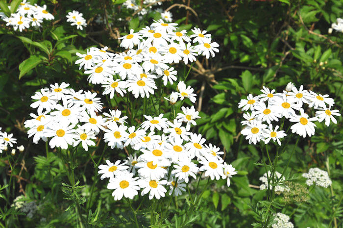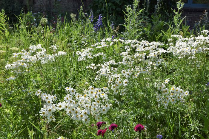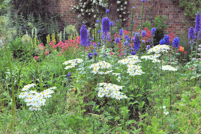 Die Straußblütige Margerite blüht zusammen mit Rittersporn, Spornblume