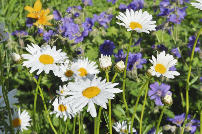 Die Margerite zusammen mit blauem Geranium und gelber Taglilie in