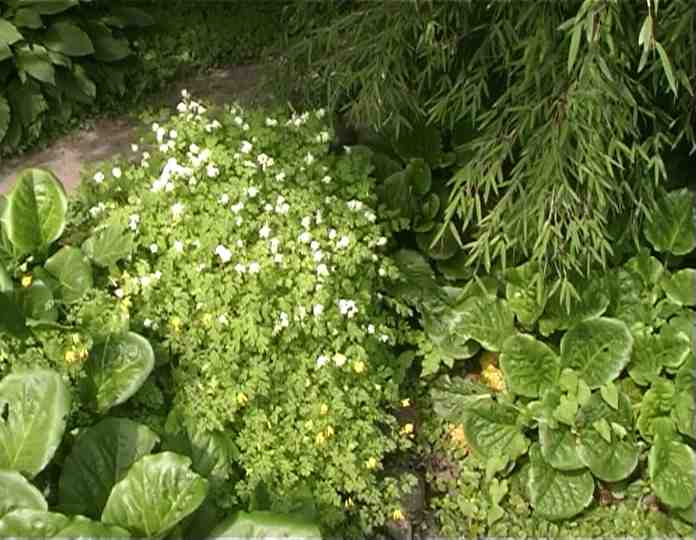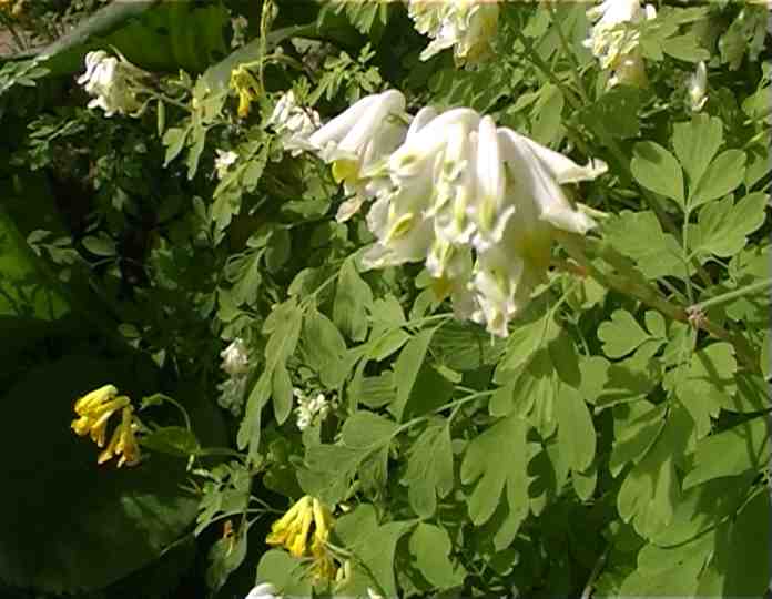 Corydalis ochroleuca, der Weiße Lerchensporn, wächst gut im