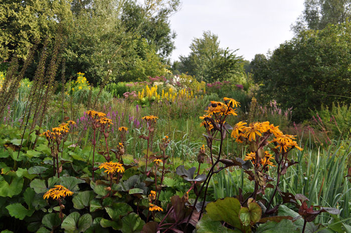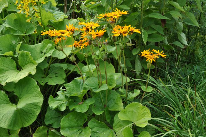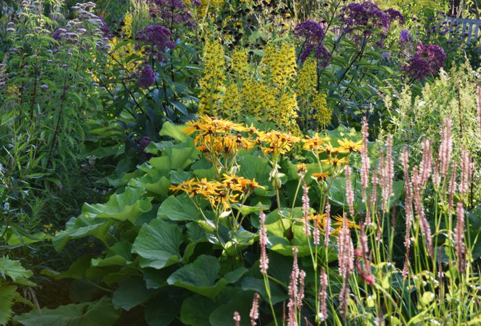 vorn Dolden-Ligularie (L. dentata) und dahinter