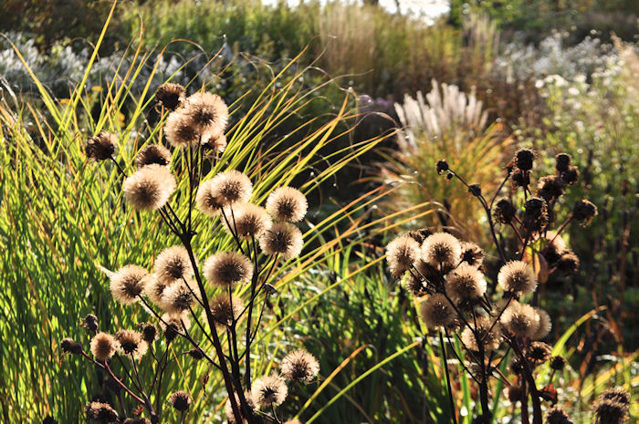 Die Doldenligularien (im Vordergrund dunkellaubige Sorten), blühen zusammen