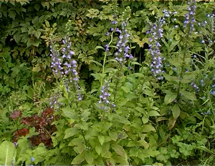 hat kleine aber sehr zahlreiche blaue oder weiße Blüten. Sie steht bei mir am Teich recht
