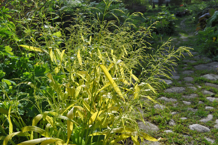 Milium effusum 'Aureum', das kaum kniehohe Goldflattergras oder die Gelbe