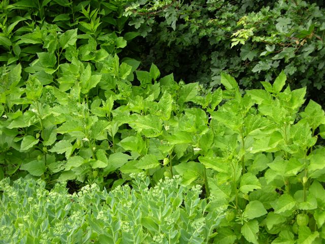 unscheinbare Pflanze mit kleinen weißlichen Blüten und grünen Lampions.
